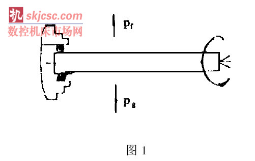 影響桿類零件加工質(zhì)量的因素很多, 經(jīng)過實踐認(rèn)為, 桿類零件在加工中所產(chǎn)生的振動是主要因素, 而振動的產(chǎn)生, 主要由四個原因所致。①桿件在高速旋轉(zhuǎn)時, 在其圓周方向?qū)a(chǎn)生圓周力, 在這里可以理解為離心力, 見圖1, 由于零件的自重力存在, 因此上、下垂直方向的離心力最大, 這兩個力隨著零件長徑比的大小而變化, 長徑比越大, 自重力就越大, 而上下跳動也就越大; 也就是說, 桿件越長越細(xì), 其剛性越差, 撓度越大, 上下跳動就越大。②在一定的切削速度范圍內(nèi), 振動是隨著切削速度的增大而逐漸增大的。③刀具的幾何角度選擇不當(dāng), 也將會增加切削力, 在相同的切削條件下, 切削力大, 振動就大。④工藝方法不合理, 同樣會引起桿件振動。